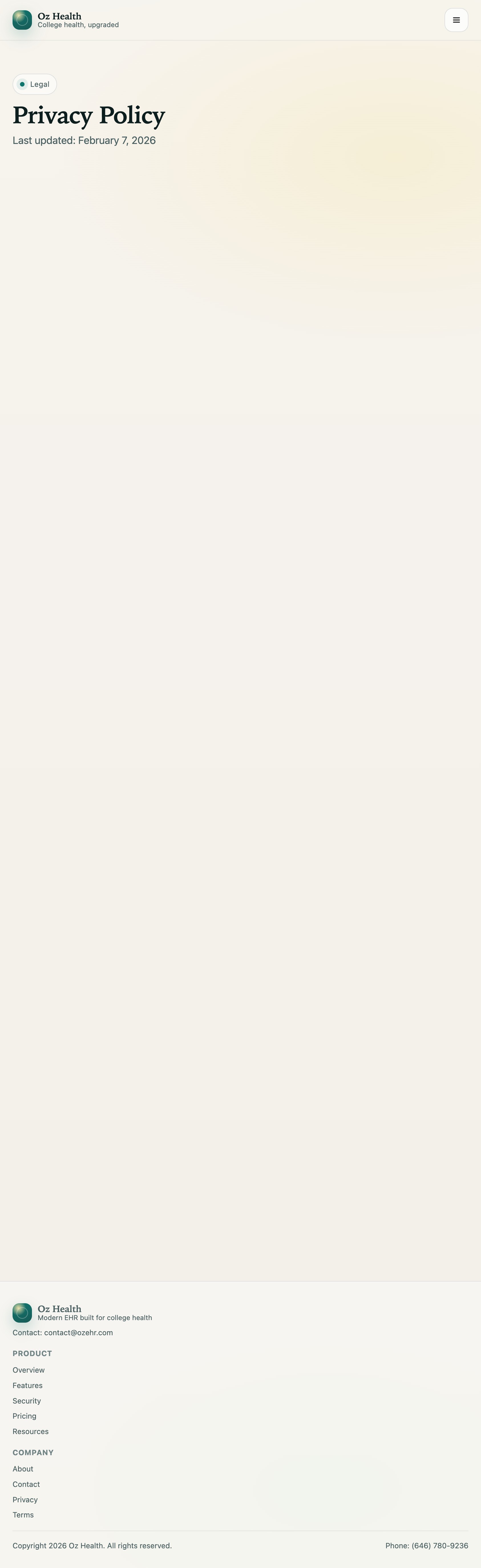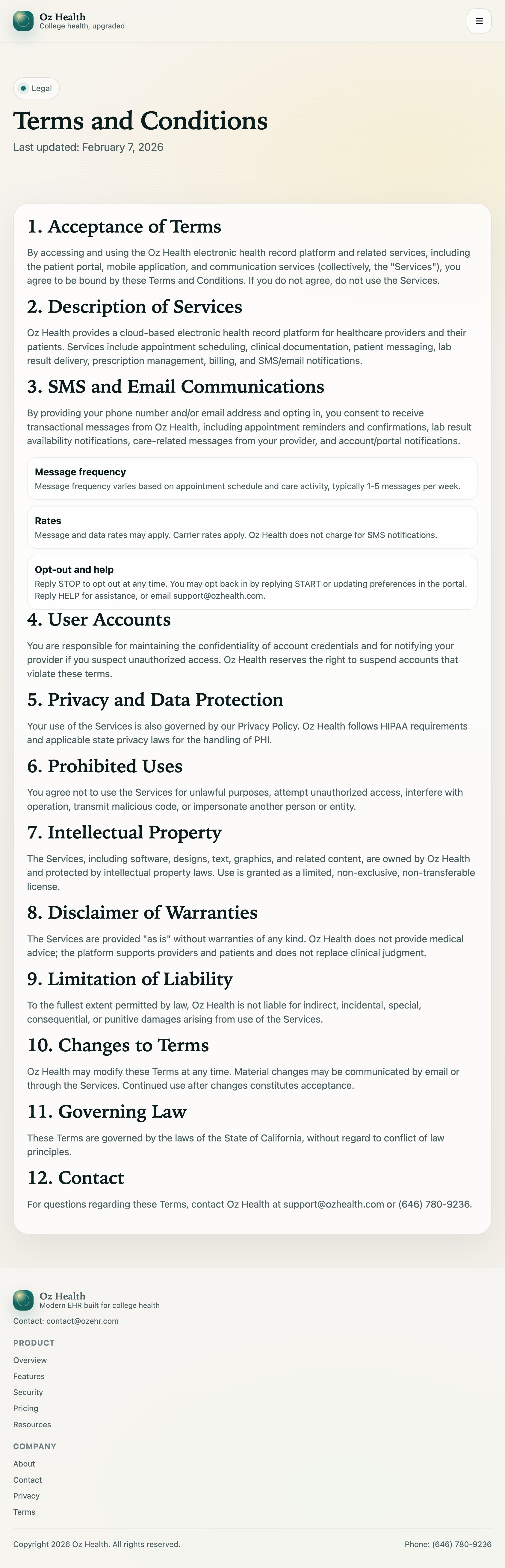 Provided as public links at ozehr.com/terms and ozehr.com/privacy and referenced in the opt-in capture section.