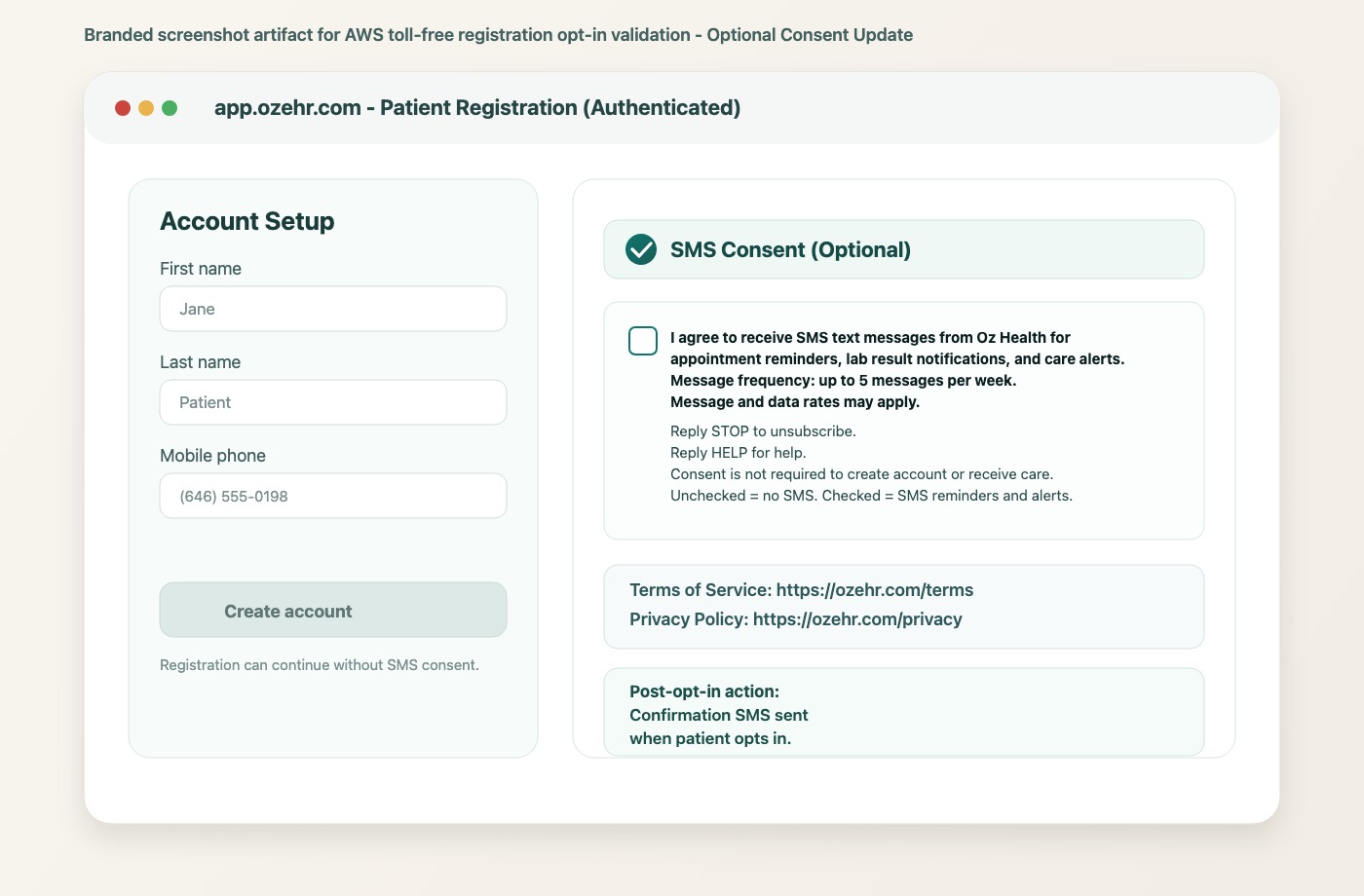 Opt-in workflow description for AWS registration update: Users register at https://app.ozehr.com and may opt in via an unchecked checkbox: "I agree to receive SMS text messages from Oz Health for appointment reminders, lab result notifications, and care alerts. Message frequency: up to 5 messages per week. Message and data rates may apply. Reply STOP to unsubscribe. Reply HELP for help." Consent is not required. Confirmation SMS sent. Terms https://ozehr.com/terms Privacy https://ozehr.com/privacy Evidence https://ozehr.com/sampleoptin.html